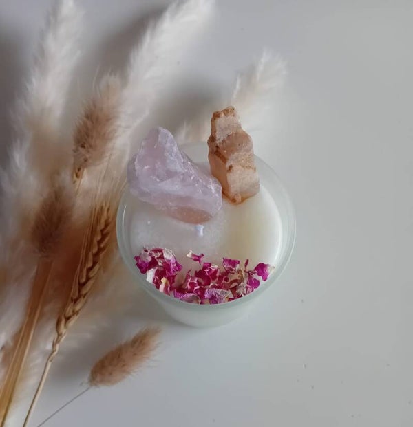 Diese Kerze unterstütz dich bei deinem Selbstlieberitual. Nimm dich an genauso wie du bist. Verbinde dich mit dir und schenke dir selbst die größe Liebe. Passend dazu befinden sich in der Kerze der Mondstein und Rosenquarz.
